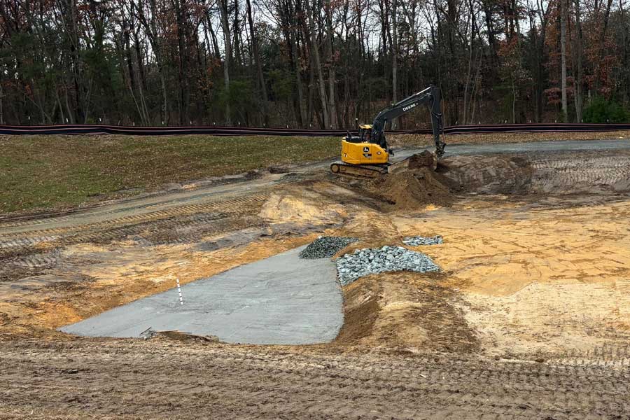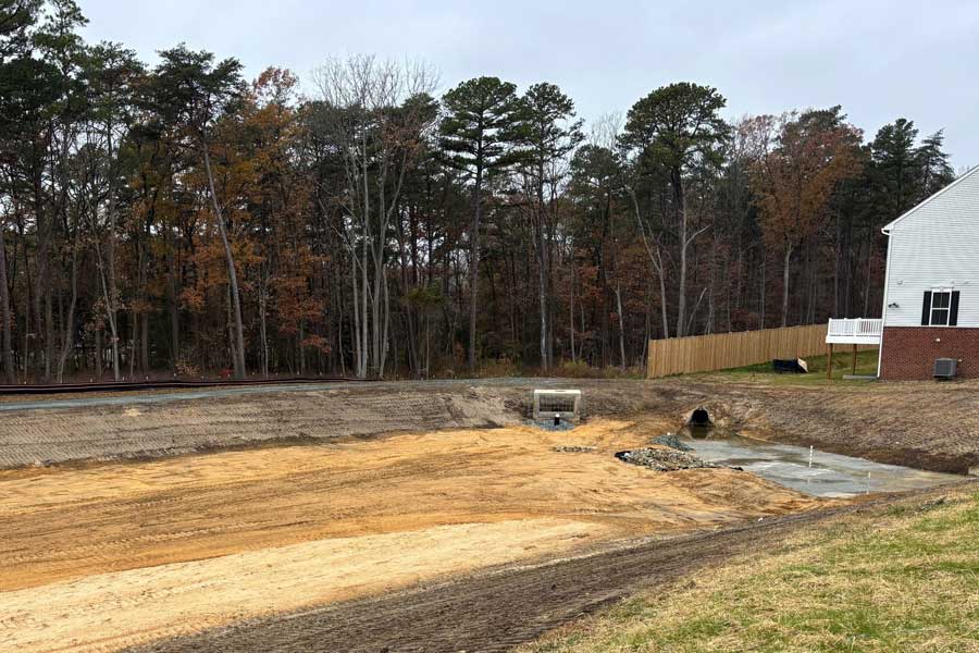 This Koch Homes development in Glen Burnie, Maryland, consists of over 150 townhouses. It has been under development for around two years. Once we finish converting the pond, final paving activities can begin, and the development will be turned over to the county.