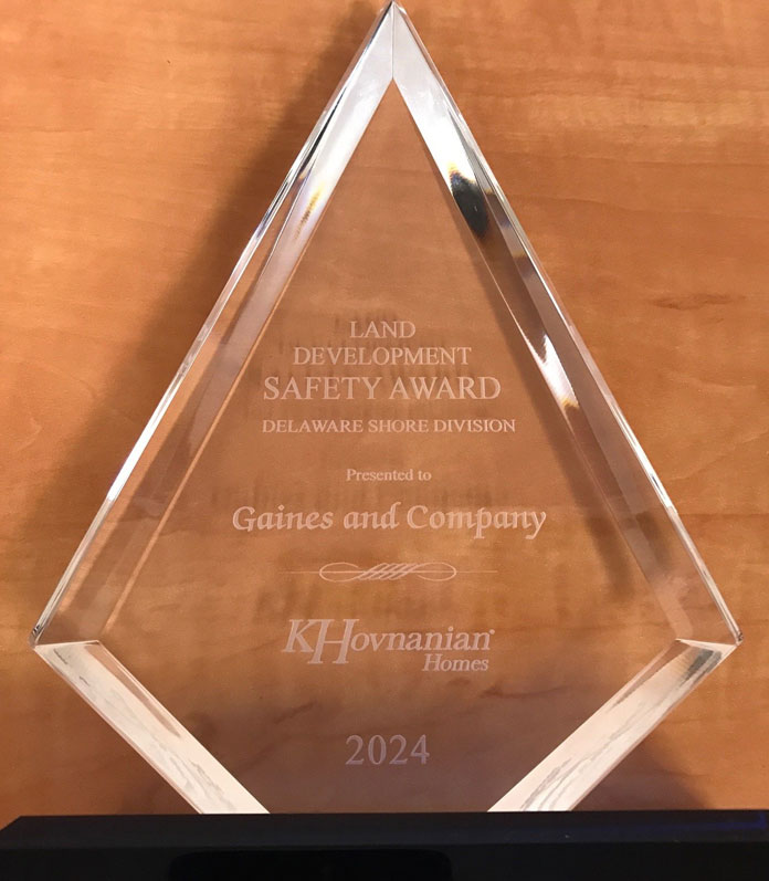 Gaines upholds quality and safety on projects – as recognized by K. Hovnanian Homes with their Land Development Safety Award, which they awarded to us for our work on their Four Seasons at Kent Island project.